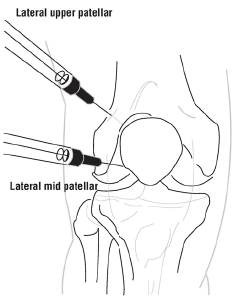 • Over the course of 2-3 minutes, inject the full 2 mL of the syringe intra-articularly (into the joint) into one knee only.